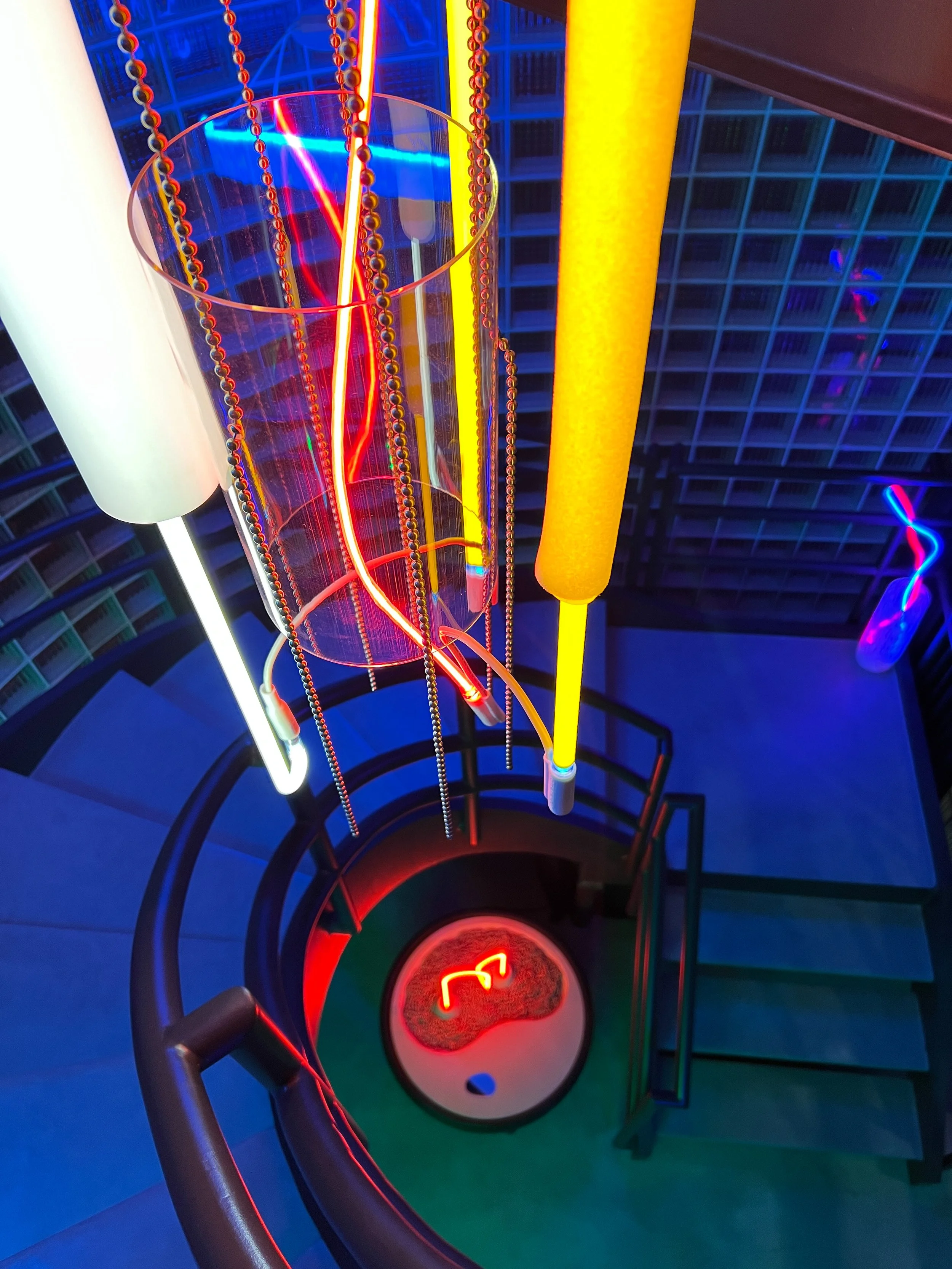 SPRING FEVER explores filtration, containment, and the tensions between gravity, material and light. Those layers are represented by translucent and textured materials, common to daily life but presented in unexpected forms. Hand bent Neon glass tubing, colored with noble gas fill, earth phosphors, and tinted glass anchor the pieces thematically to the body of Laura Stevenson’s work.